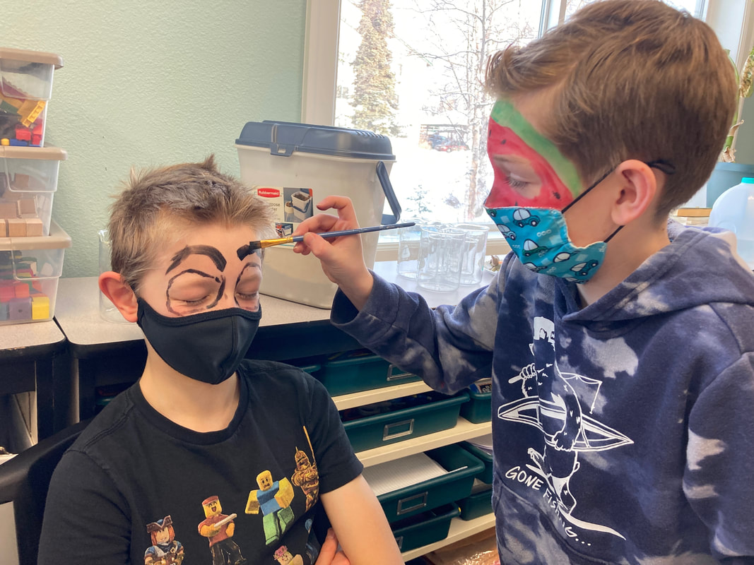 Coincidentally, our students were celebrating in art class, too. They’ve been discussing Festival in Italy. They worked together using their faces as their canvases. To say they were excited would be an understatement. You can see the smiles behind their masks.