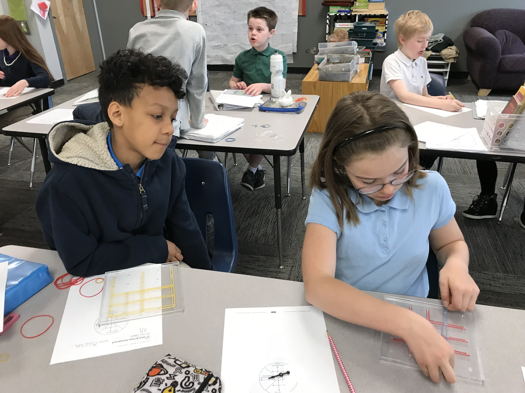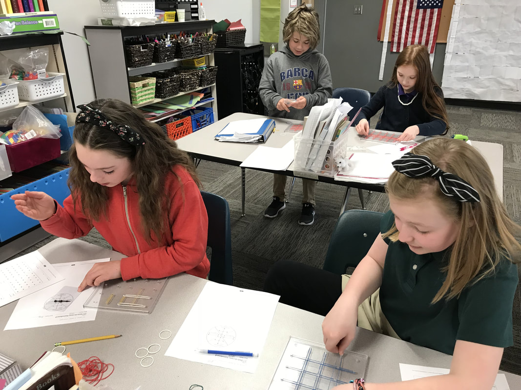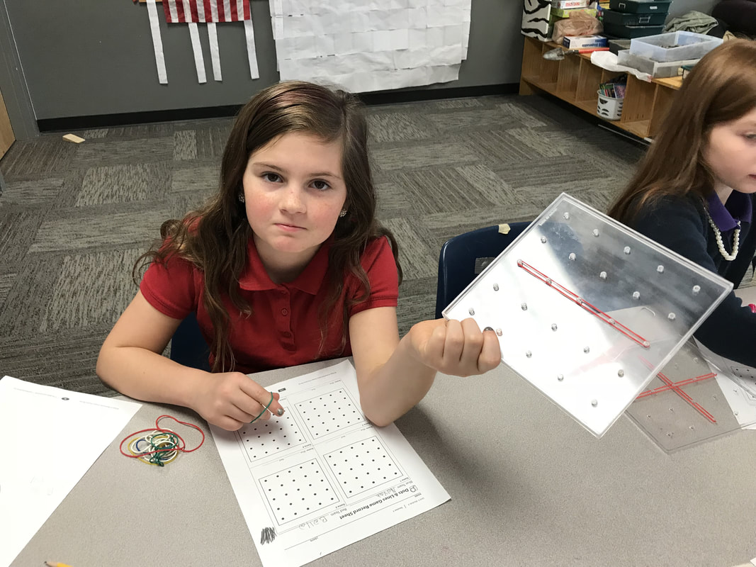 Students worked their way through learning about rays, angles, points, and everything between (no irony intended). Fourth grade math used geo-boards (plastic squares with pegs that allow rubber bands to be mounted on them) to experiment with bisecting, perpendicular, and parallel lines.