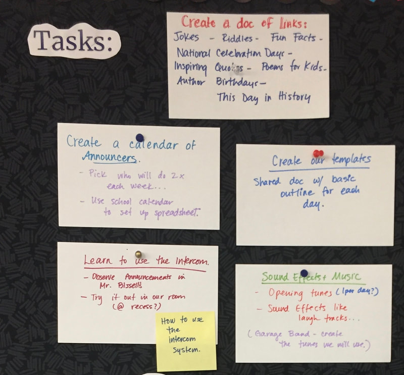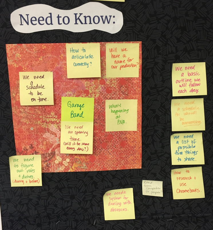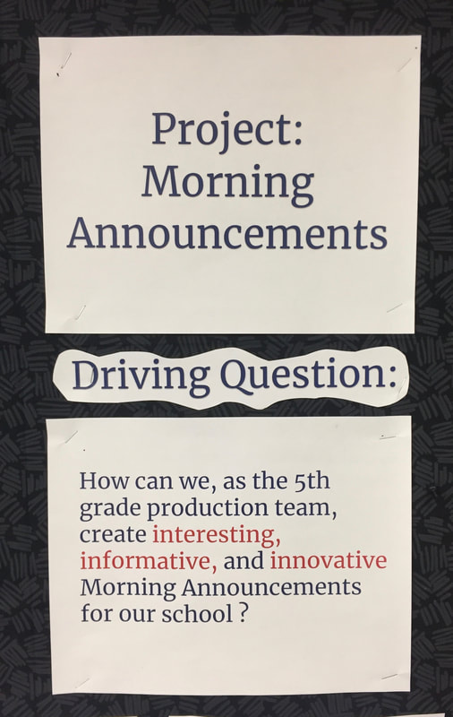 The 5th grade has decided to pursue the following driving question: “How can we, the 5th grade production team, create interesting, informative, and innovative Morning Announcements for our school?” Students were excited to pursue this project: they immediately identified the things they needed to know and the tasks they needed to complete. Project work time was focused and productive, and by the end of the week, scripts were prepared, a calendar for the coming months was developed, and everyone was ready for Monday’s first performance. Several practice runs and testing of the intercom system assured the team that they are ready!