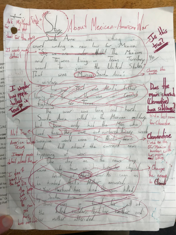 In the photos above, students read through their stories not with the eye of a writer, but with the eye of an historian. They looked for possible flaws and anachronisms within their stories, and did their best to correct them. They didn’t always have the answers, but that’s okay — the point of the exercise was to find those questionable items and then further research them for accuracy.