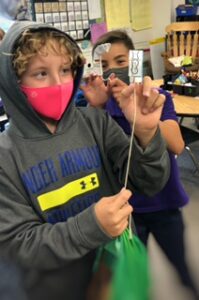 To go deeper into the subject, students began to explore how the muscles in their body move. They discovered the mechanism that their muscles use to control the movement of their bodies. Students took this knowledge and constructed a “robot finger” using string to represent the tendon and creased and cut paper to represent the joints.