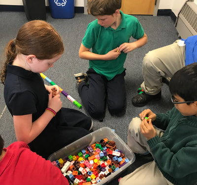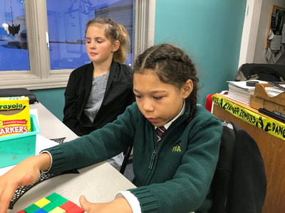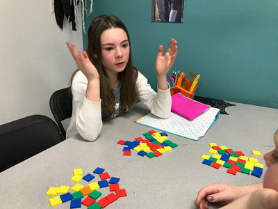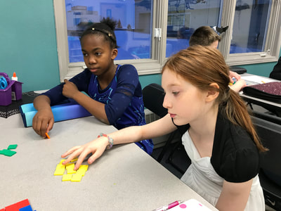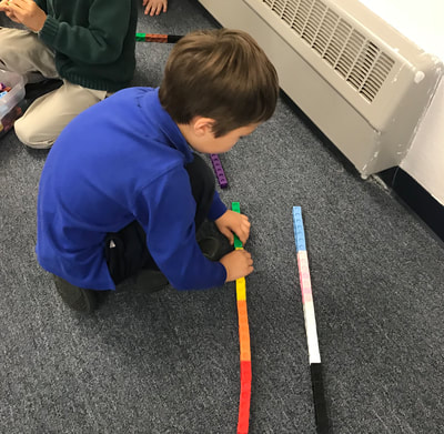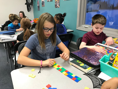 Additionally, later in the week Fourth and Fifth grade students worked on multiplication of fractions using tiled arrays. Students created patterns with tiles in order to gain a better grasp on exactly what, for example, 1/4 times 24, or 1/2 times 24, actually look like.