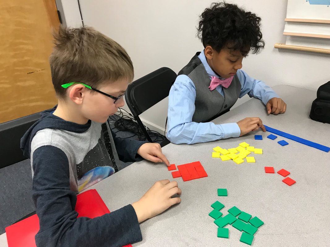 Additionally, later in the week Fourth and Fifth grade students worked on multiplication of fractions using tiled arrays. Students created patterns with tiles in order to gain a better grasp on exactly what, for example, 1/4 times 24, or 1/2 times 24, actually look like.