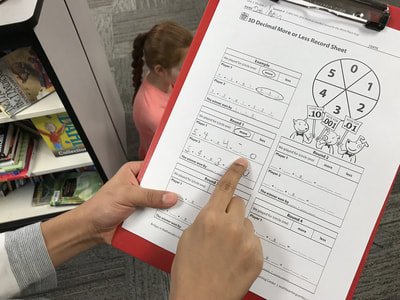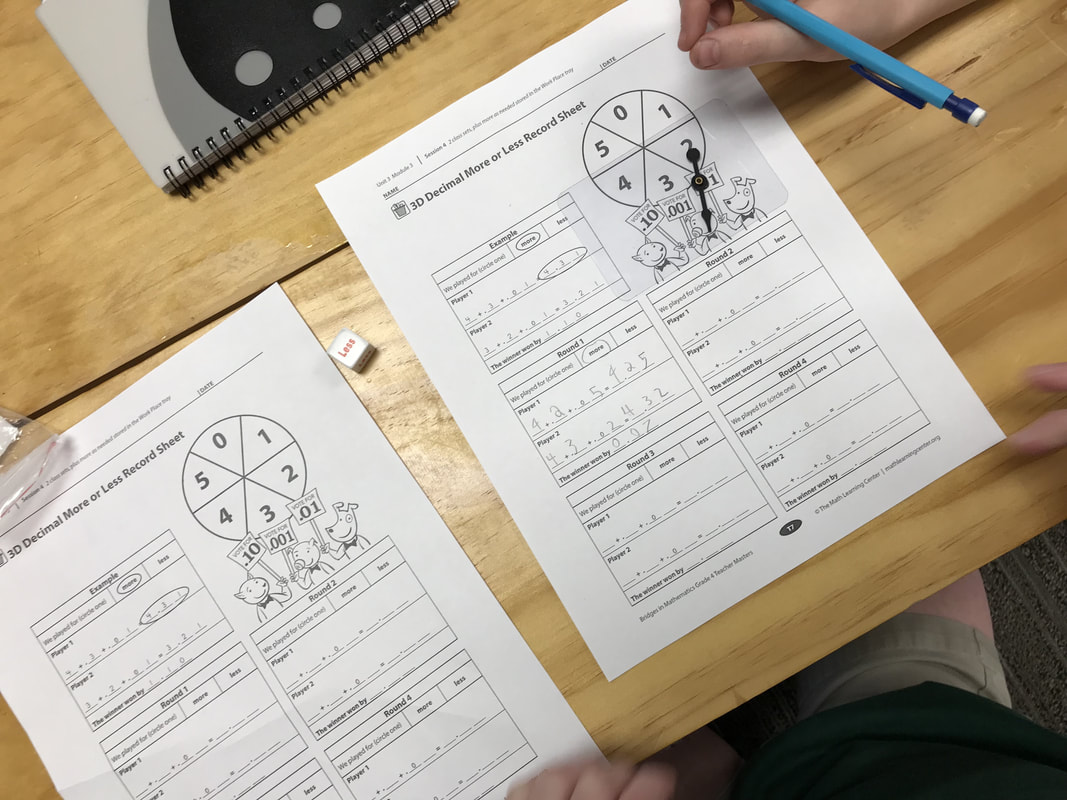First, players rolled a ‘More Or Less Die’ to determine whether the goal was to create a lower decimal or a higher decimal than their partner. Once the goal was determined, next the players used a spinner to figure out the numbers they were given to work with. Finally, players had to place those numbers into the a blank XX.XX format. In order to win, students really had to understand the ins and outs of tens, ones, tenths and hundredths… and how much ‘value’ they held in their place!