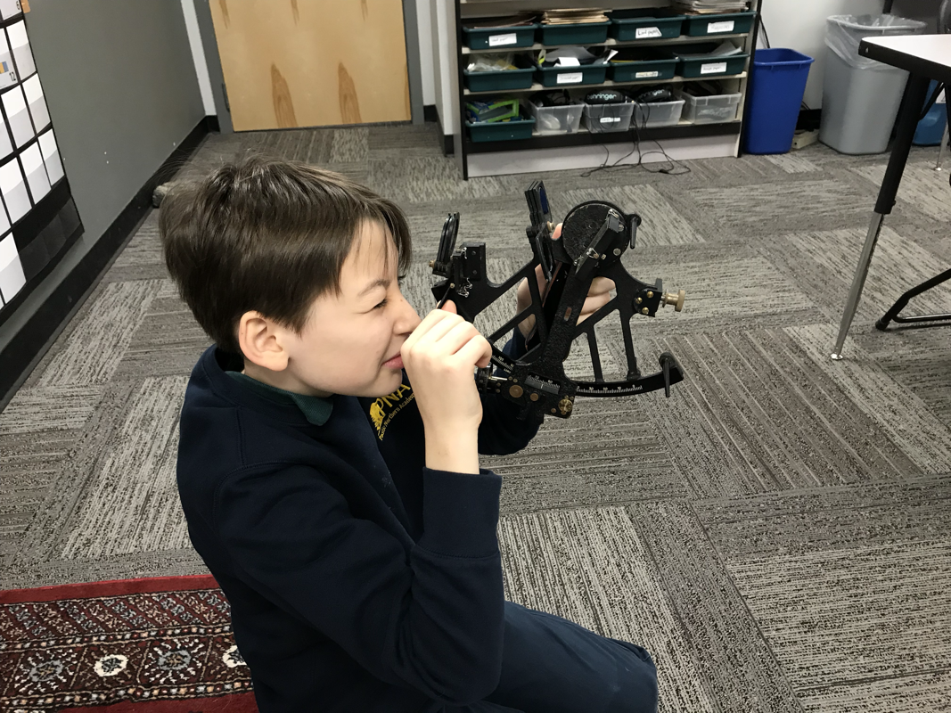 Students were treated to two great guest speakers (that also happen to be parents) this week on the topic of exploration. Our first guest speaker, Paul Fuhs spoke briefly to the students about navigation with a sexton and chronometer.