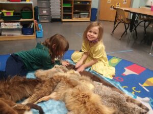 about these animals, learned about their habitats, and honed fine motor skills and imaginations as they drew their own rendition of these animals habitats. Later, the Orca class discovered what animals do in the winter and learned important vocabulary words such as migration, hibernation, and adaptation. They built shelters for bears to hibernate in and acted out a play about a fox and a beaver to identify particular adaptations of each. The students loved exploring adaptations that animals use to help them stay warm in the winter. We were fortunate enough to borrow a fur kit from the Alaska Department of Fish and Game (ADF&G). The Orcas were enthralled by all the different furs, some thick, some thin, as we
