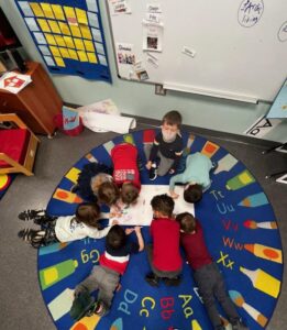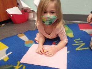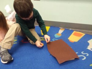 discussed how these furs helped the animals in their particular environment. A favorite was the sea otter fur. So warm and soft! We watched videos of Alaska Natives adapting to Alaskan winters by turning seal furs into warm winter coats. To top the week off we explored the tracks animals leave behind them in the snow and told stories about what the animals were doing, where they were going, and