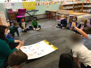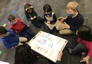 After practicing previous sounds, a new phoneme is introduced. The students say the new sound and observe the positioning of their mouth as they say it. The students are then given several words to identify the positioning of the new sound in each word. Afterwards, they gather to create an anchor chart for the phoneme. Students turn and talk with a peer to come up with as many words as possible that begin with the new sound. Each student shares a word, and a picture is drawn on the anchor chart for each word given.