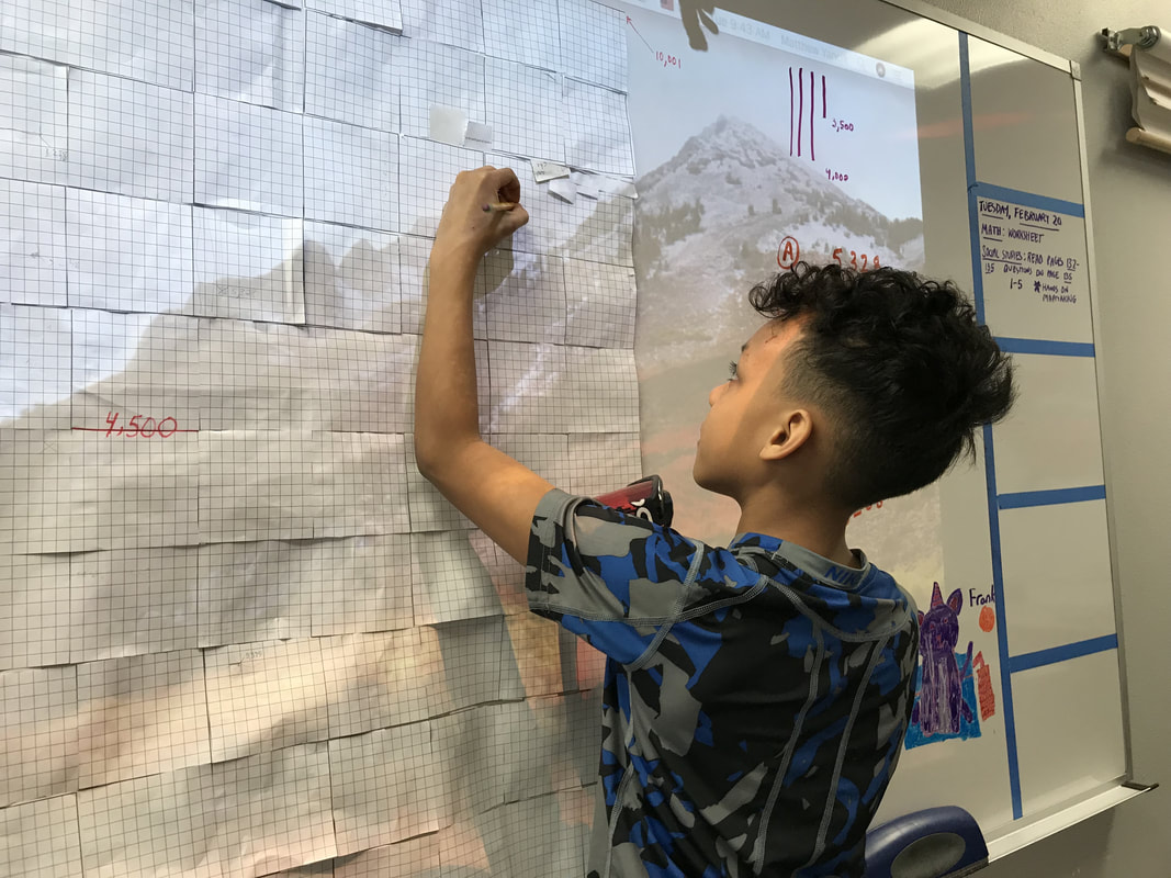 We also worked on another ‘mat-mat’ — which is a 100 mat grid of smaller, 10,000 unit grids, which when combined totals a whopping one million. (But don’t tell the students that, it’s their job next week to calculate what they’ve assembled.) In the video below, students work together to assemble their one million unit grid.