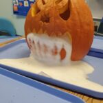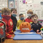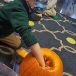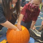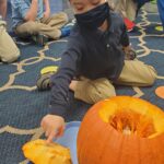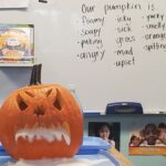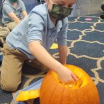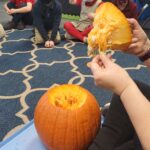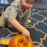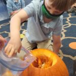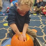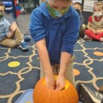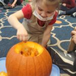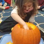 Among other things happening in the Beluga classroom this week, we have been exploring interesting adjectives. Autumn naturally lends itself to adjectives because there are so many things about it which appeal to our senses –the sight of the brilliant colors of leaves and grasses, the damp, earthy, and slightly sour smells of the woods this time of year, feeling the crisp air on our skin, and hearing dry leaves crunch under our feet. Halloween-time also provides wonderful opportunities for expanding vocabulary because there are so many interesting and unusual things to be described! Why limit yourself to words such as “wet” and “gross” to describe the inside of a pumpkin, when you could use words like “squishy”, “stringy”, or “slimy”? Language acquisition has always fascinated me, and, as an early childhood teacher, I know that a child’s oral language skills are a strong predictor of their future reading skills. A rich language base, which is also tied to cognitive growth and experience, provides a strong foundation for reading, writing, and comprehension later on in school. Children who have large vocabularies and good knowledge of the alphabet learn to read more easily than do those without that background. Consequently, we focus a lot of attention on oral language skills in preschool.