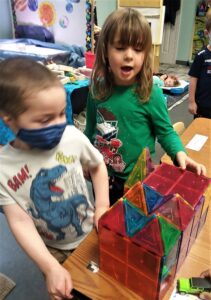 - Social and Emotional Development: Imaginative play gives students many opportunities to work together with others in role-playing situations where they need to learn how to voice their concerns, opinions, or give directions. Acting out stories can also teach valuable lessons about getting along with others. This month, our class learned how to send messages to each other to inform others of our needs, wants, or interests. To punctuate this lesson we enjoyed acting out the story of Little Bunny Foofoo. Each child got a role in the story. At the end we discussed the message that that good fairy gave to Bunny Foofoo and each child got to imagine a different scenario where Foofoo did listen to the fairy’s message.
